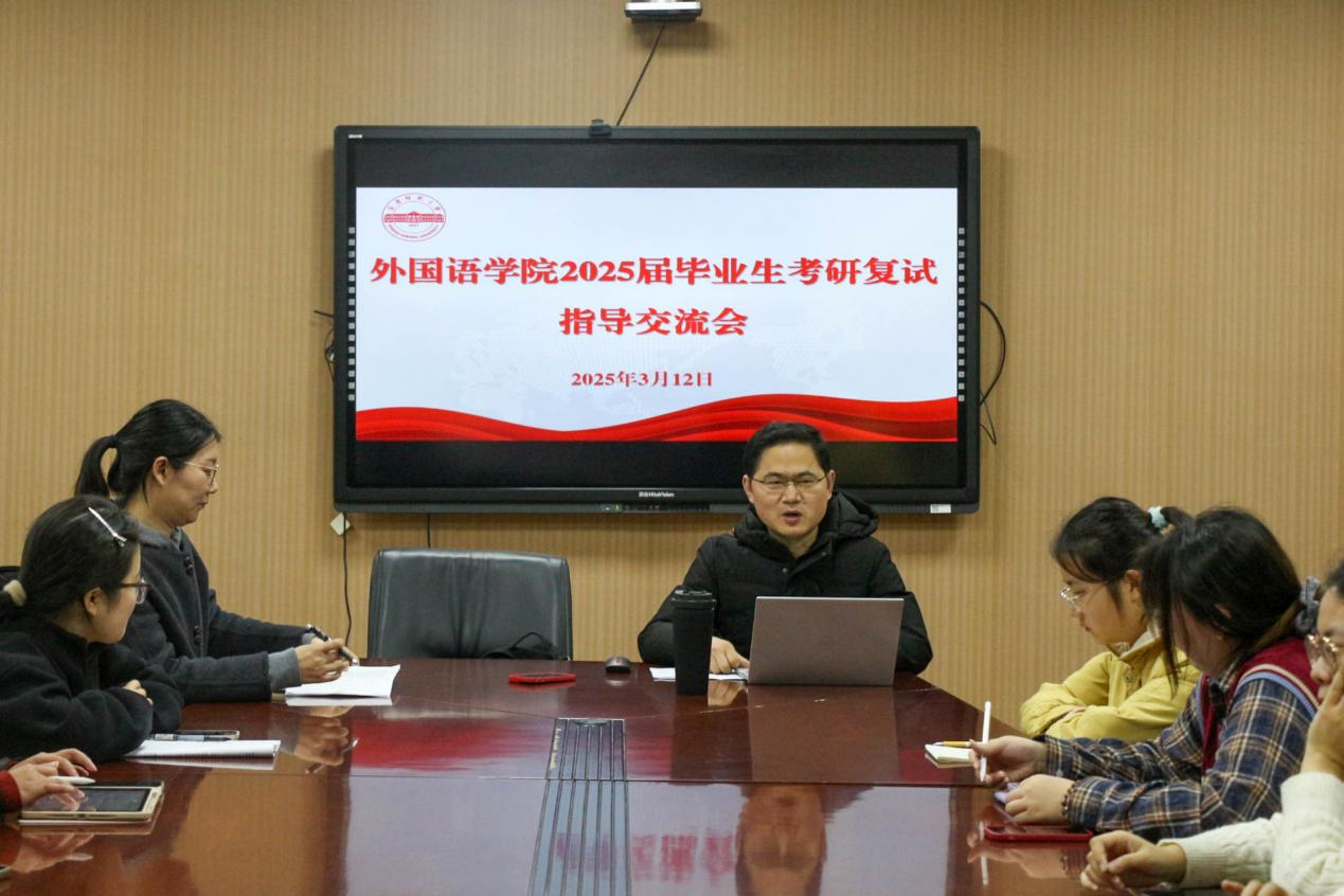 会议现场,翻译教研室陈水生博士对报考翻译和英语语言文学两个专业方向的毕业生进行复试指导。他指出,复试不仅考查学生的专业知识,还注重综合素质、语言表达能力和临场应变能力。他建议同学们在备考过程中从语言技能、专业知识、学术潜质三方面提升自己,根据报考院校的复试要求有针对性的进行复试准备,同时对视译技巧、专业术语特色词、中英文本比较阅读等方面内容进行了深入讲解。