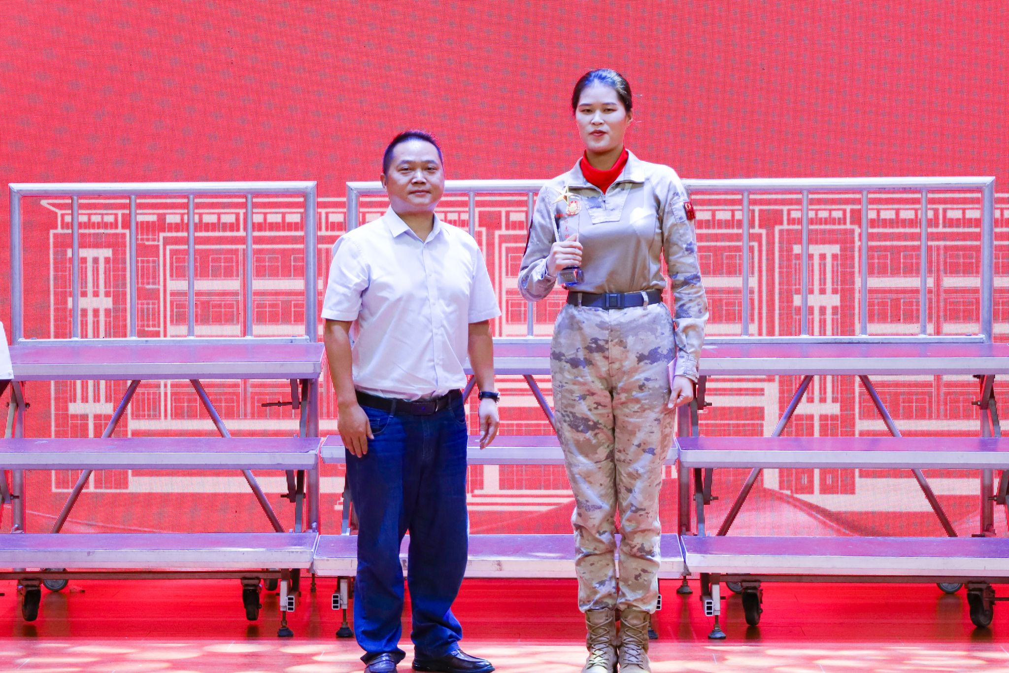 党委书记徐华胜为老生代表93阅兵参与者、商务英语2023级1班谭宁颁发“海角