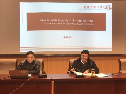党总支举行学习贯彻党的是十八届六中全会精神专题报告会,马克思主义学院党总支书记余精华教授作了《加强和规范党内政治生活的新举措》宣讲报告。海角