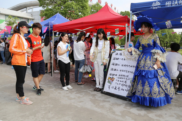 在各国的文化展区,皆有穿着该国特色服装的表演者,或法国以丝绸拼接,刺绣相绕的蓝色贵族服装;或日本动漫里可爱服装;或英国白色公主裙。她们在展示着自己服装的同时还介绍着这些服装的文化,引得很多同学围观。各国展区桌上摆着的各国各色小蛋糕、点心及饮料,免费供观者食用,让同学们在知识和美食中徜徉。
