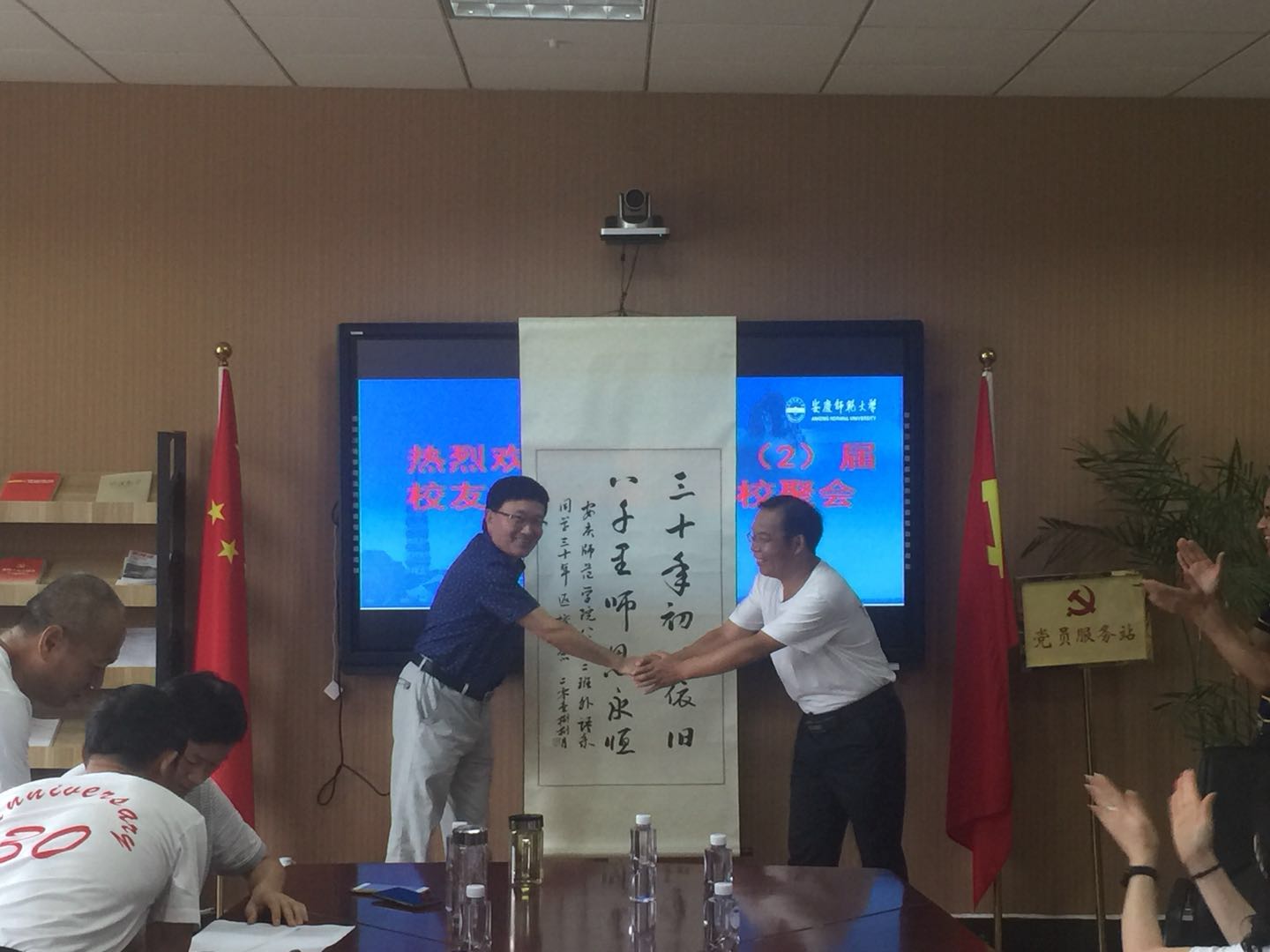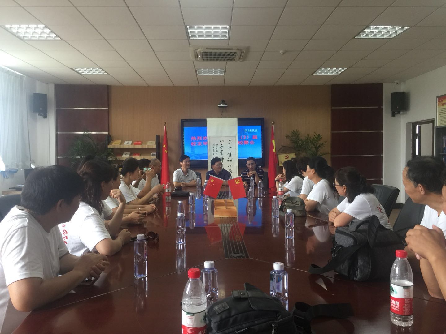 8月21日,海角 党政领导在会议室热情接待参加外语系88(2)届毕业三十周年返校聚会的校友。