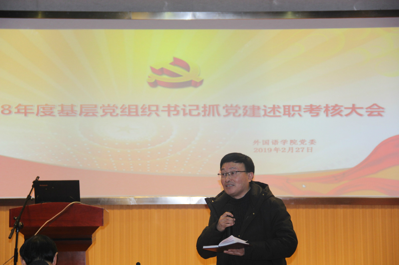党委在E503会议室举行2018年度基层党组织书记抓党建述职大会,根据会前方案,来自学院5个学生党支部书记和6个教工党支部书记逐一上台展示汇报。党委书记郝涂根同志听取各支部书记述职并分别点评。