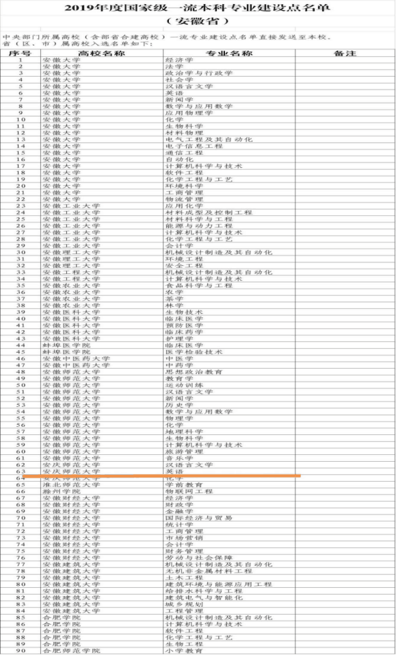 2019年12月24日,教育部办公厅印发《教育部办公厅关于公布2019年度国家级和省级一流本科专业建设点名单的通知》(教高厅函〔2019〕46号),我院英语专业入选国家级一流本科专业建设点。在外国语言文学类专业中,全省仅安徽大学与海角