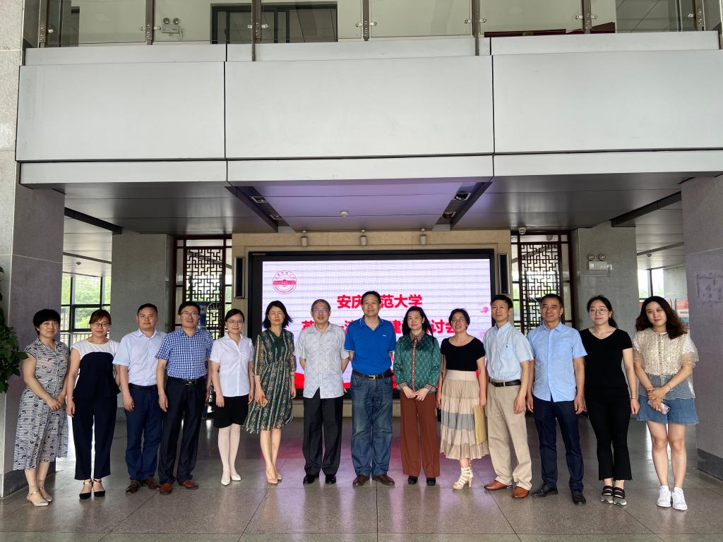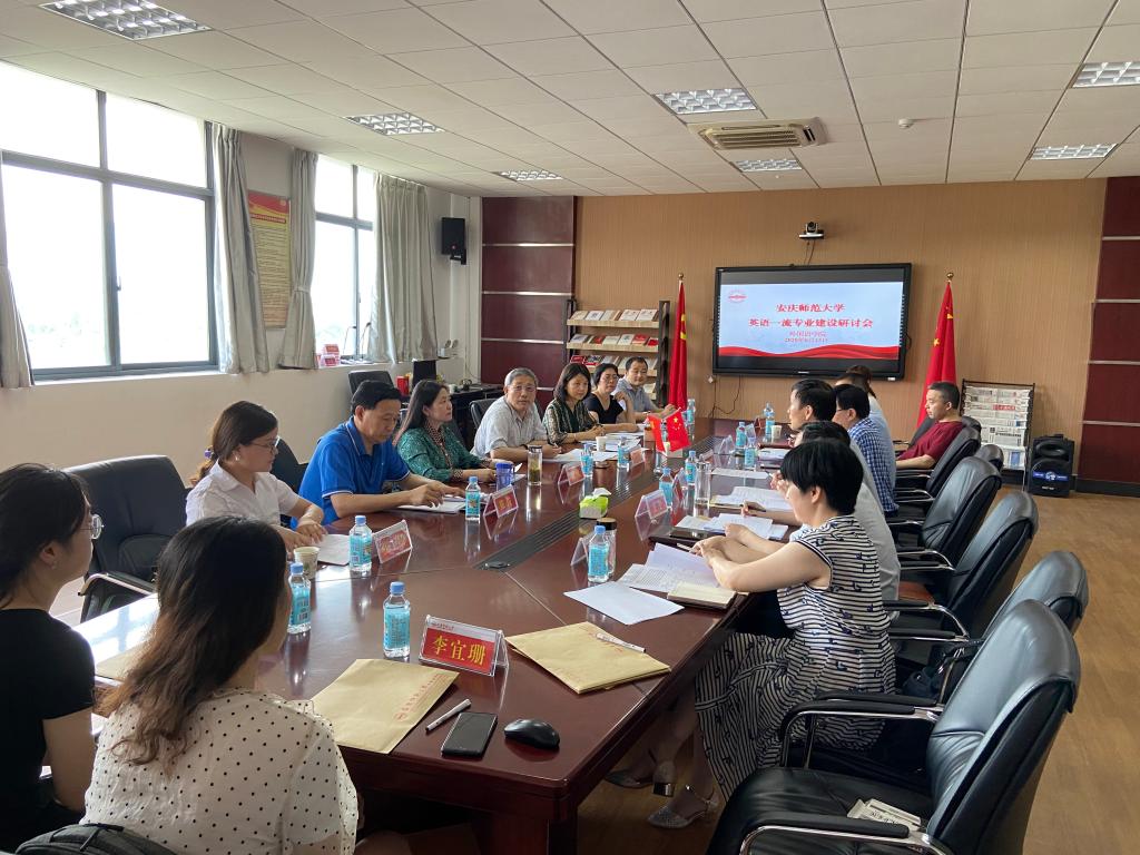 在E304会议室举行英语一流专业建设专题研讨会。安徽大学博士生导师胡健教授、淮北师范大学周启加教授、安庆市教育教学研究室资深英语教研专家、正高级教师陈俊、安庆市石化一中特级教师、正高级教师罗慧英、安庆市大观区英语教研员何雪晴、海角