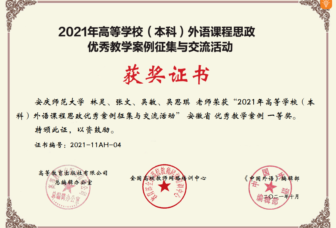 10月8日,由高等教育出版社、全国高校教师网络培训中心、《中国外语》编辑部联合举办的“2021年高等学校外语课程思政优秀教学案例征集与交流活动”结果揭晓,海角