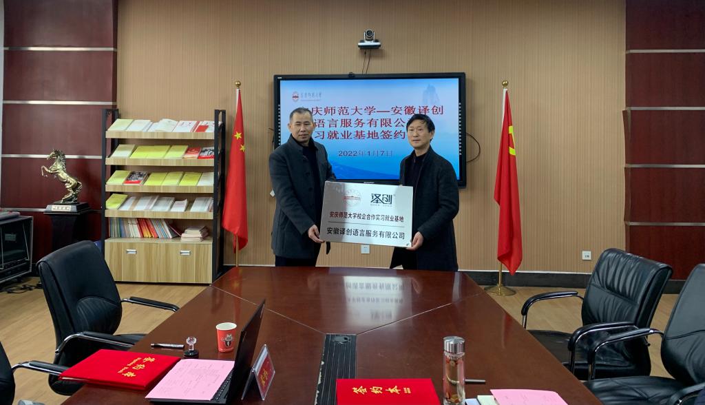 与安徽译创语言服务有限公司举行联合共建实习就业基地签约和揭牌仪式。安徽译创语言服务有限公司总经理施永双、执行总监朱小二,海角