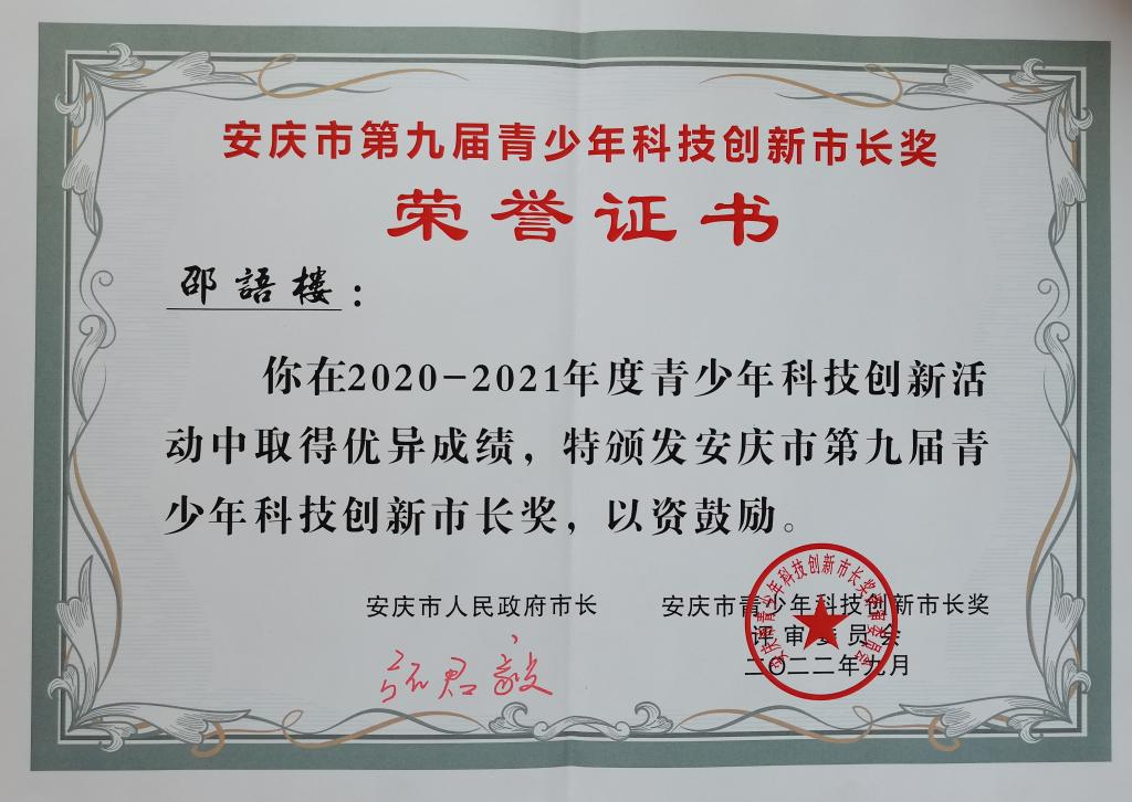 邵语楼同学获评“安庆市第九届青少年科技创新市长奖”。