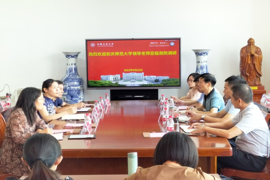 领导及相关部门负责同志就大学英语课程“三进”工程、课程学分设置、提高和发展级别课程设置、课程教学资源建设、无纸化考试等方面进行了深入交流和讨论。此外,双方还就2023版人才培养方案制定的指导原则、学科建设、翻译硕士点合格评估、毕业生实习和就业等话题展开交流。
