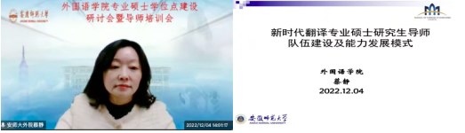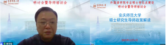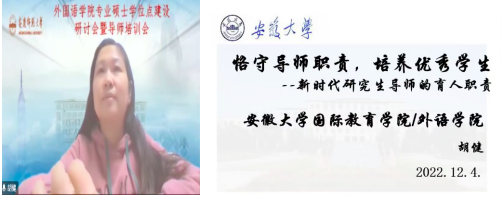 翻译硕士和学科教学(英语)专业学位硕士点建设基础,12月4日下午外国语学院在腾讯会议平台召开硕士学位点建设研讨会暨硕士生导师培训会。安徽大学国际教育学院院长胡健教授、安徽师范大学海角