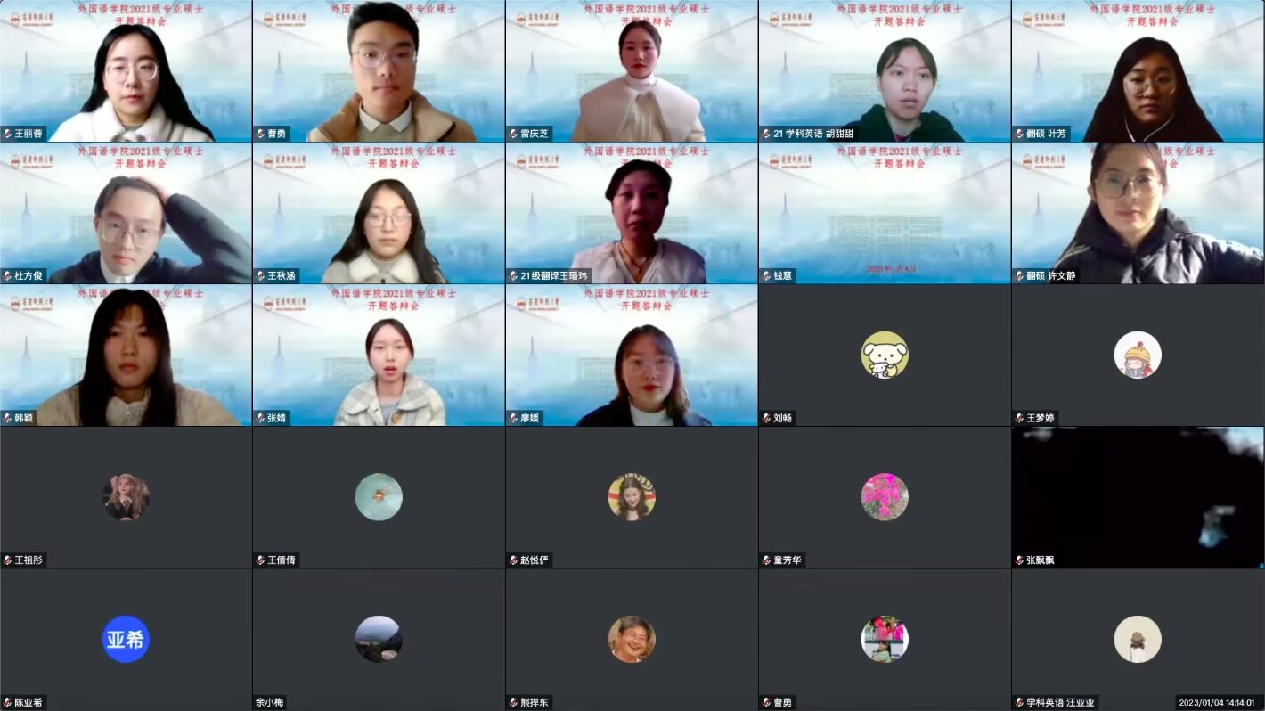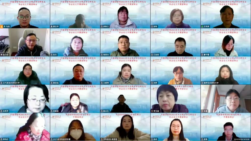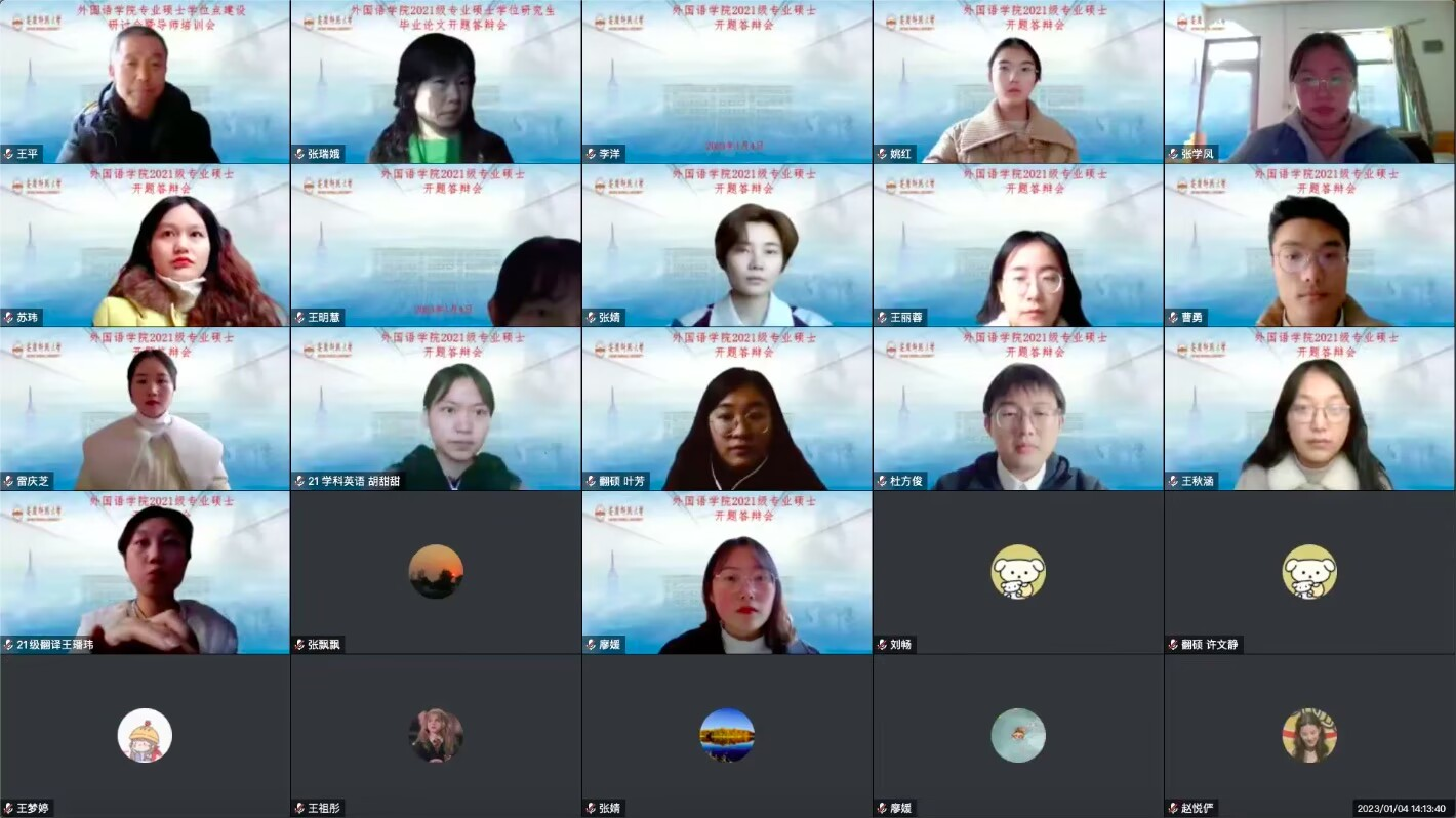 于2023年1月4日举行了2021级专业学位硕士研究生学位论文开题答辩会,会议以腾讯会议形式在线进行。2021级学科教学(英语)和翻译硕士两个专业领域的29名同学分成7个答辩小组进行了答辩,25位导师担任答辩小组专家。