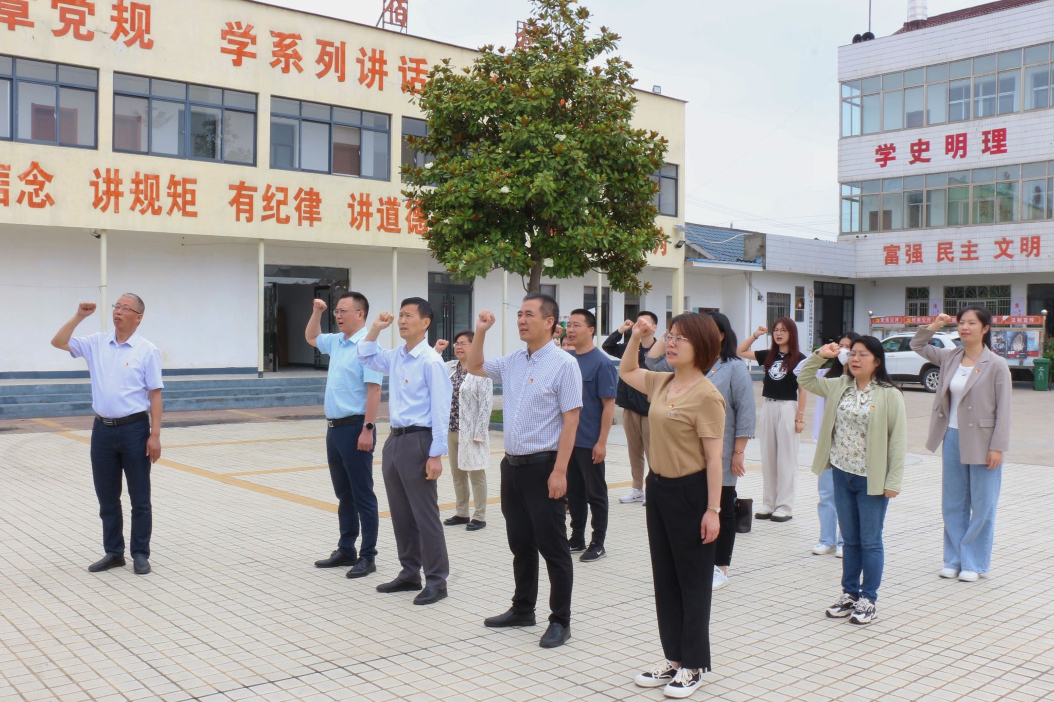 随后,大家来到渡江战役回民村起渡点纪念碑前,感受先烈艰苦奋斗、公而忘私、不计得失的革命精神。“我志愿加入中国共产党,拥护党的纲领,遵守党的章程……”党员们面对党旗重温入党誓词,短短12句誓词,铿锵有力,充分展现了党员干部坚决拥护党的领导的决心和传承革命精神的理想信念。