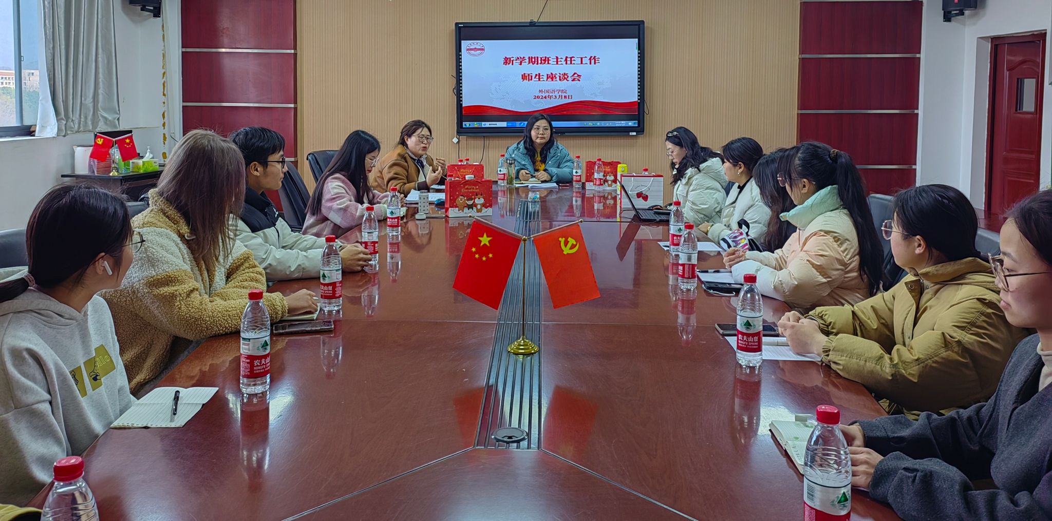 于304会议室召开2023-2024学年第二学期班主任工作师生座谈会,学院党委副书记何媛君出席会议,2023级各班级班主任、辅导员和学生代表参加会议。