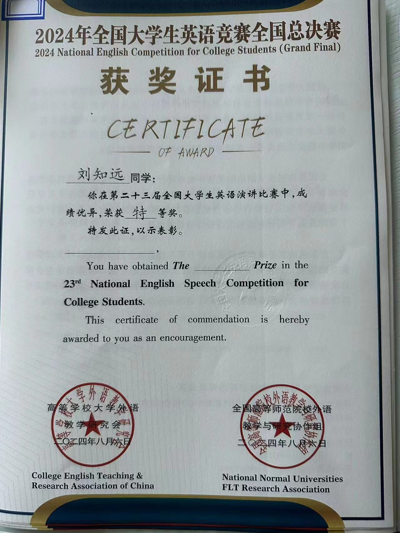 英语专业2021级刘知远同学荣获英语演讲比赛全国特等奖,英语辩论赛全国一等奖和英语风采大赛全国二等奖,同时获得优秀参赛选手称号和最佳个人表演奖。指导教师毛慧获得国赛优秀指导教师称号。
