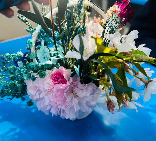 另一间教室内,一场“永不凋零的春日”正在上演。同学们先用绢布、铁丝和热熔胶制作仿生花:捻转铁丝为枝,剪裁绸缎为瓣,再用酒精灯轻烤花瓣边缘塑形,原本零散的材料逐渐化作玫瑰、铃兰与郁金香。紧接着,同学们一起将花插在花篮中,让花朵以另一种形式永生。