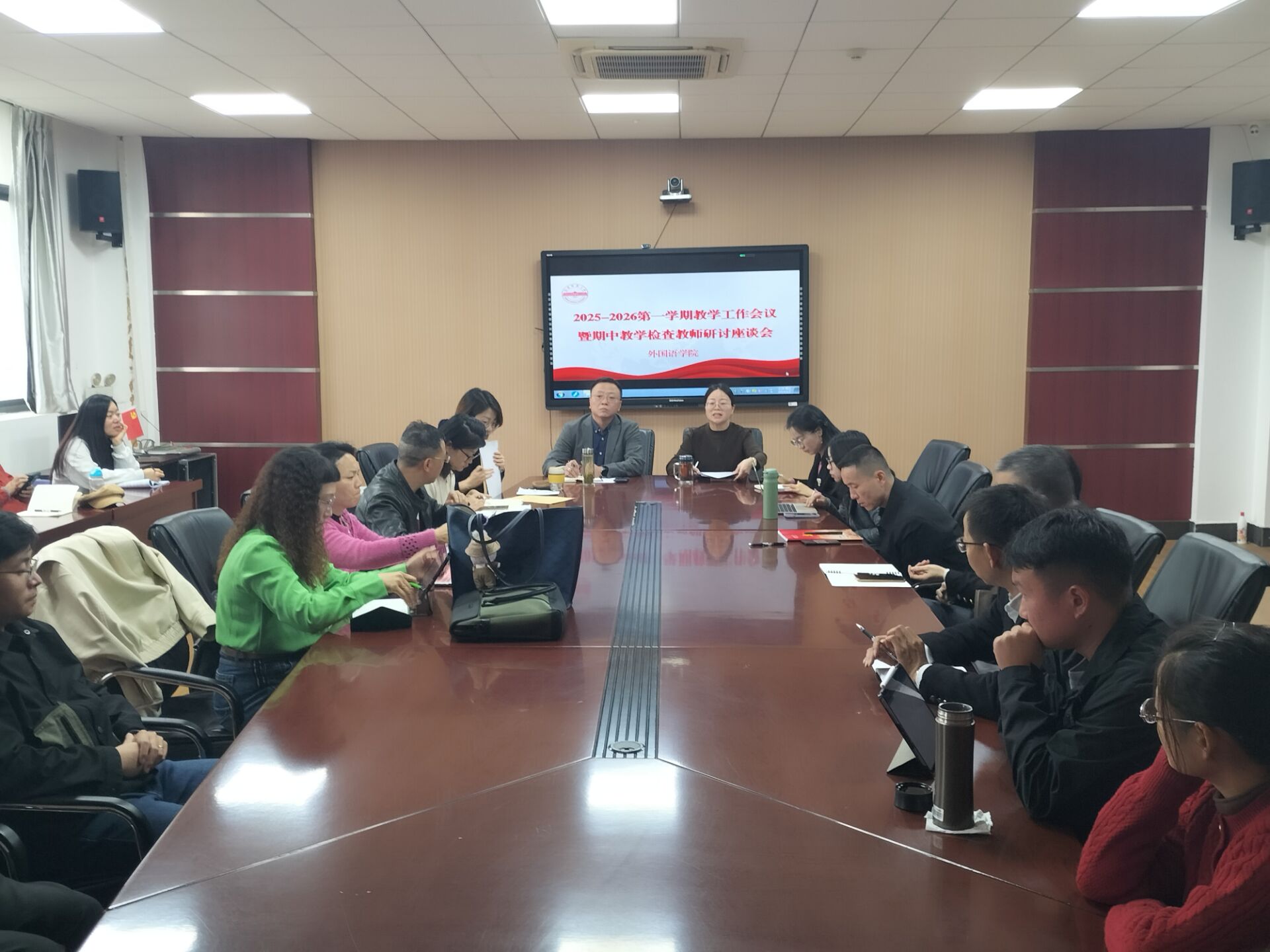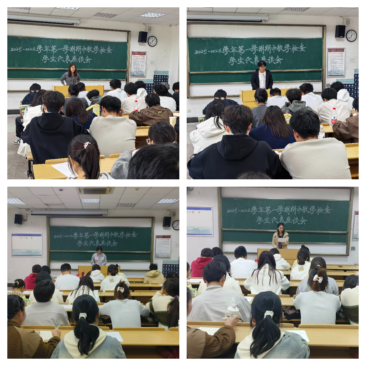 在E304会议室和E314教室同步举行2025-2026学年第一学期期中教学检查教师研讨座谈会与学生评教座谈会。学院副院长黄全灿、瞿宁霞,各专业负责人、教研室主任、院级教学督导、AI课程负责人及骨干教师、新进教师代表参会;全校非外语类与外语类专业学生代表参加评教座谈。