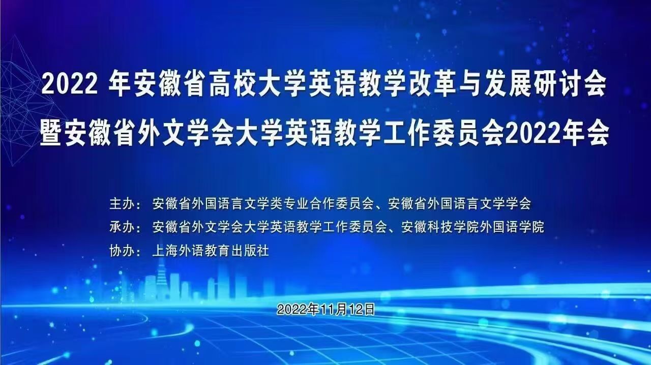 在全国上下深入学习宣传贯彻党的二十大精神之际,2022年安徽省高校大学英语教学改革与发展研讨会于11月12日在线举行。本次会议由安徽省外国语言文学类专业合作委员会、安徽省外国语言文学学会主办,安徽省外文学会大学英语教学工作委员会和安徽科技学院海角
