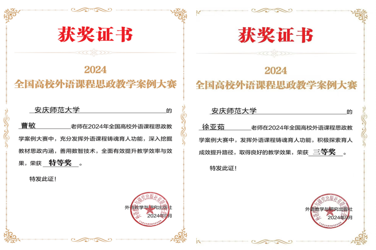 喜获两个奖项,曹敏老师基于《大学英语视听说》的课程思政教学案例荣获特等奖,徐亚茹老师基于《大学英语读写教程》的课程思政教学设计作品荣获三等奖。