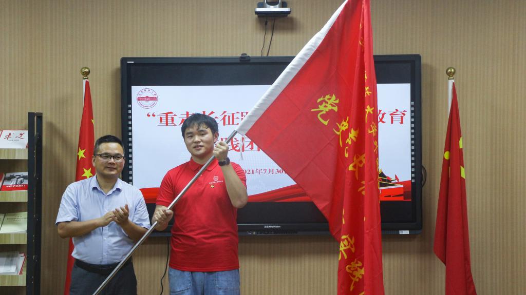 仪式中,陈东将队旗郑重授予实践团并提醒队员,此次征途均为低风险区,大家戴好口罩,勤洗手。要安心也要安全,必须服从带队老师安排,尊重当地风俗习惯,遵守当地疫情防控要求。