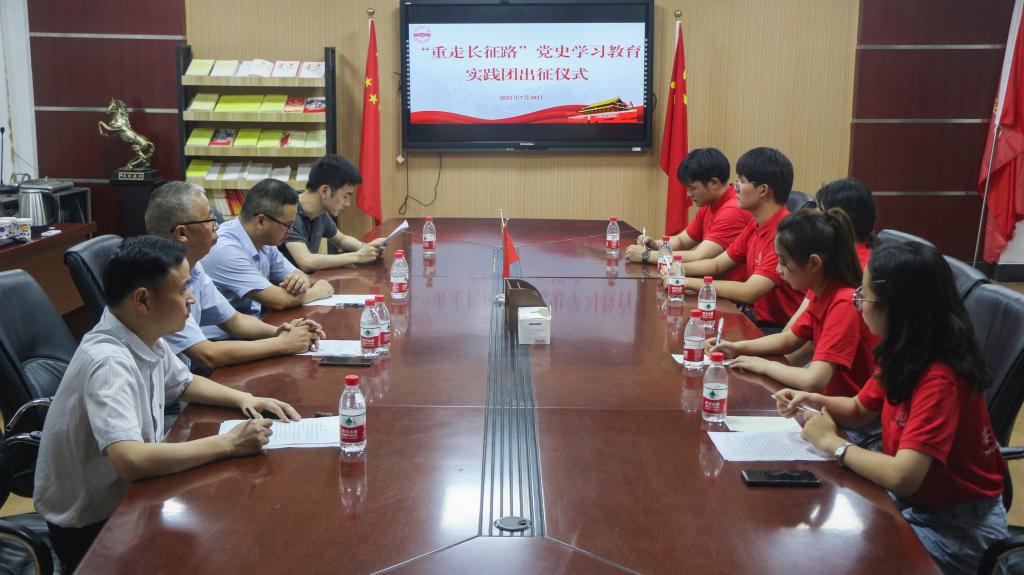 “重走长征路”实践团出征仪式于E304顺利举行。学院党委书记李亦亮、校团委书记陈东、学院党委副书记夏斐及实践团全体成员参与此次仪式。仪式由夏斐主持。