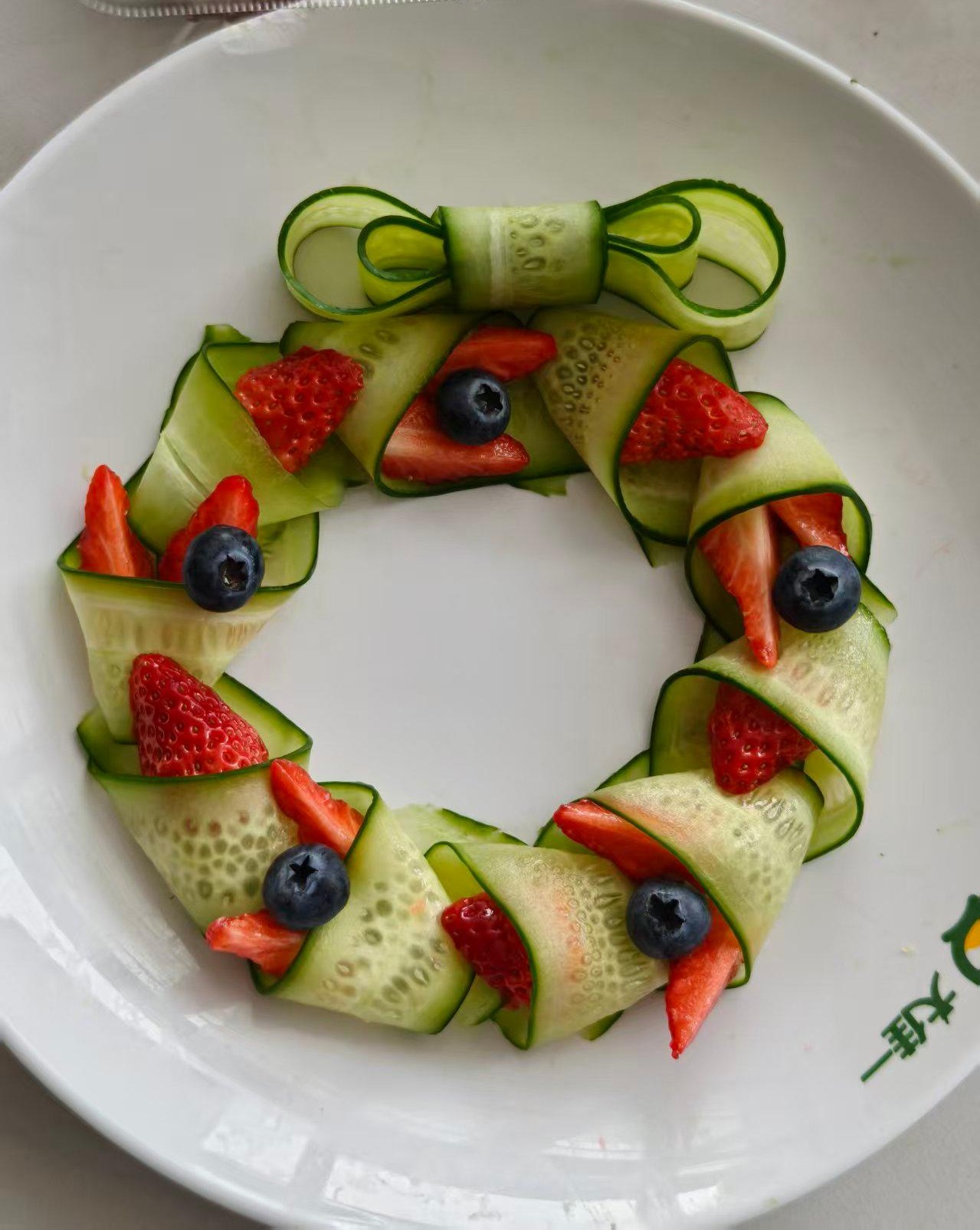 各参赛团队提交了菜肴及水果拼盘制作方案、成品照片、团队分工以及制作视频。评审小组围绕作品完整度、菜品创意、团队分工等多个维度进行综合评定。“食光小队”队伍的水果拼盘作品以黄瓜薄片卷成卷,嵌入草莓,点缀蓝莓,整体环绕成圆形,将新鲜水果与传统吉祥文化相结合,色彩清新、韵味雅致。“好耶开饭啦”队伍的水果拼盘作品《彩蝶逐春》寓意丰富,蝴蝶象征着蜕变、新生与自由,也代表着春日的生机与活力,传递出迎接美好、展翅高飞的积极祝愿。