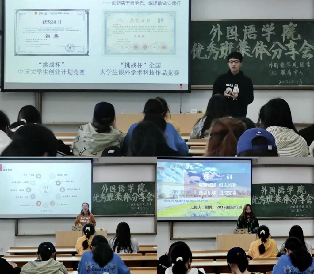 于E107举办优秀班集体分享会,特邀请2021年度校十佳班集体2018级英语1班、先进班集体2019级商务英语1班、2019级翻译2班的班委们分享经验,2021级全体班委到场聆听。