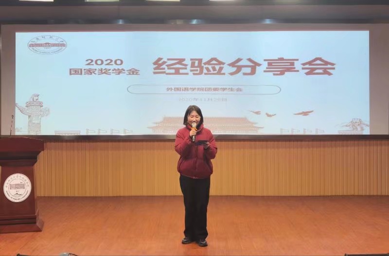 于E503举办2020年度国家奖学金获得者经验交流会。本次交流会邀请到2017级英语(合作)1班范文君和2018级英语1班詹海祥两位获奖者作为主讲嘉宾,2020级英语专业辅导员谢小雨老师及2020级近一百余人参加会议。