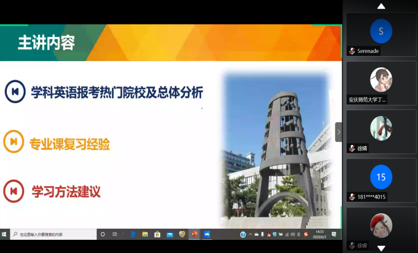 依托线上平台成功召开了考研经验交流会,11位2016级学生代表及300余名学生参加了此次会议。