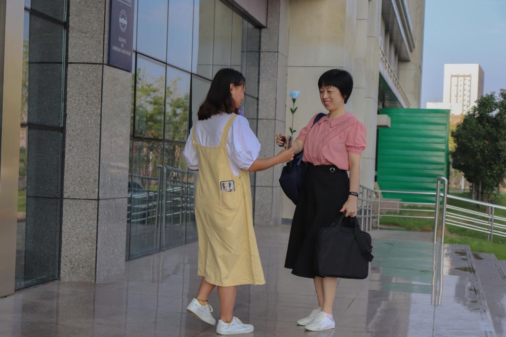 在9月10日上午举办“感谢师恩”主题活动。外院学子早早地来到了学院门口,将亲手书写的明信片和手工制做的康乃馨、玫瑰花送给前来上课的老师,并送上教师节祝福。