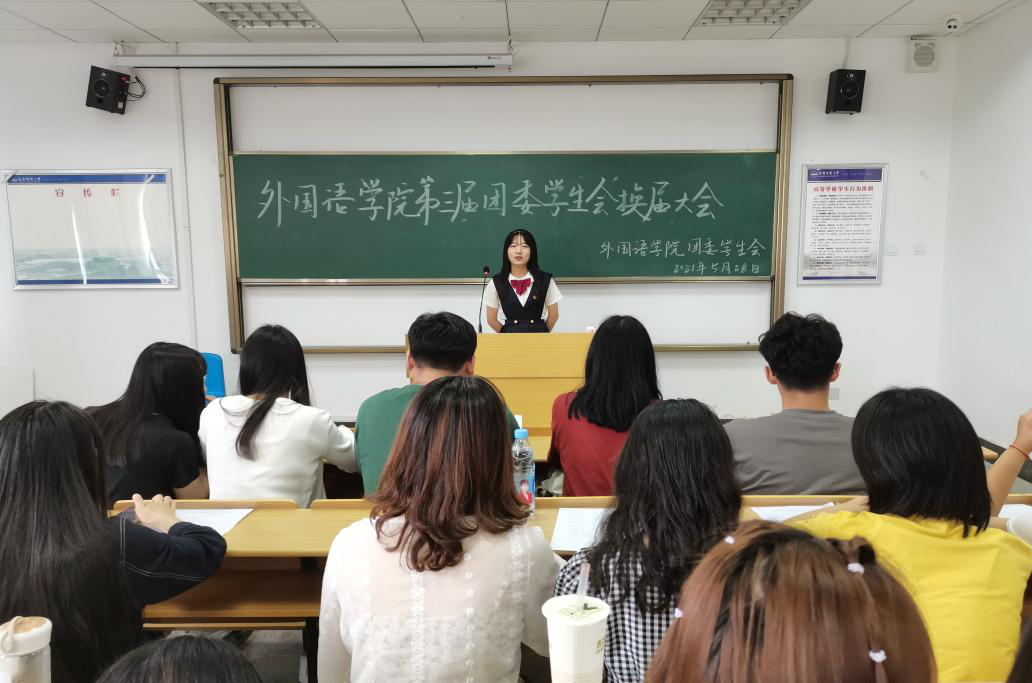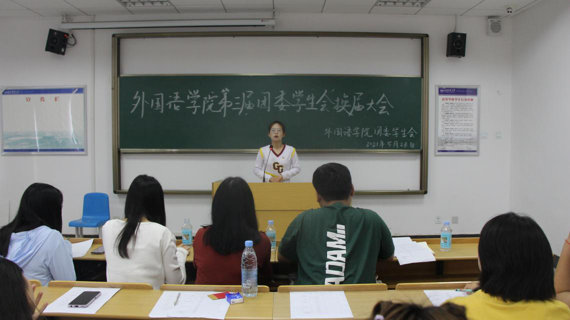 于E316举行第三届团委学生会换届竞选大会。学院团学工作负责人及第二届全体团委学生会成员参加会议,2018级英语2班王子宜担任主持人。