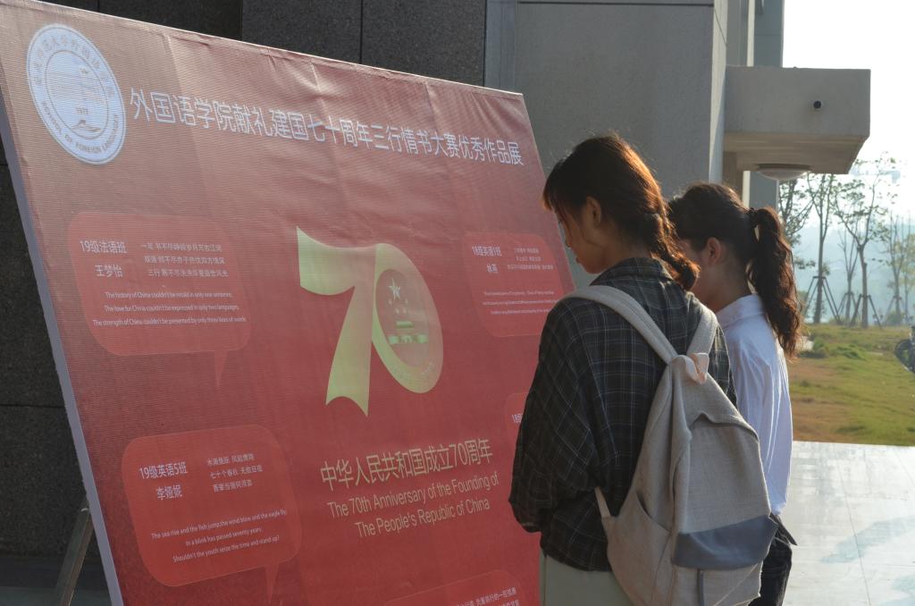 门口展出,吸引了大批师生驻足观看。王梦怡说出了自己参加活动的感受:“思索了很久,最终想到这三句话,虽然简单,但真切表达了我对伟大祖国的爱。”