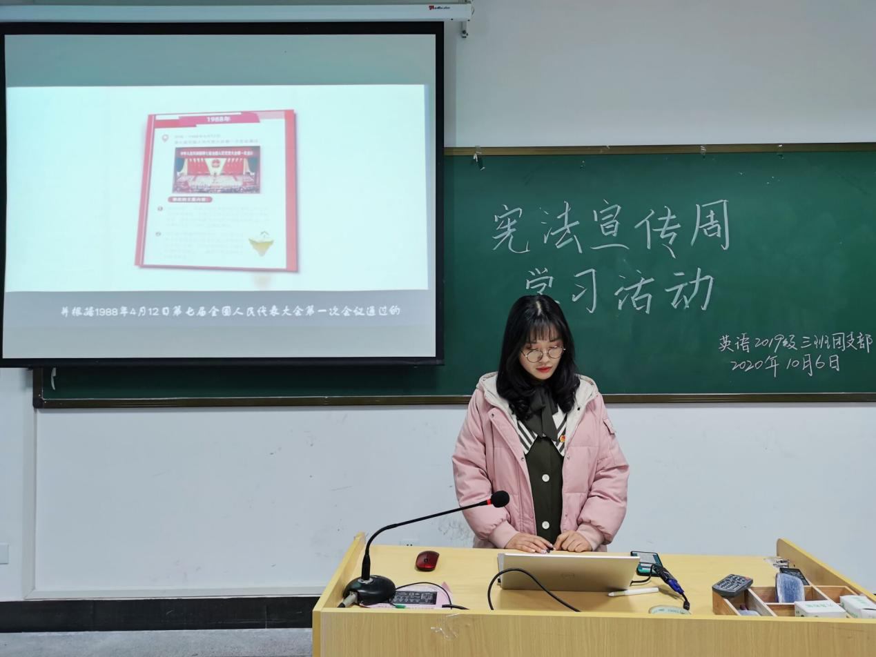 英语2019级1班顾秀秀在分享学习心得时说道:“通过此次宪法宣传周活动,我更加清楚地认识到宪法作为国家根本大法的重要性,我们每个公民都应做宪法的忠实崇尚者和自觉遵守者。“