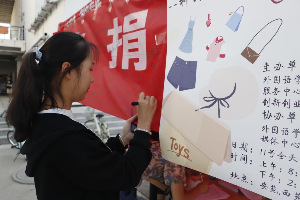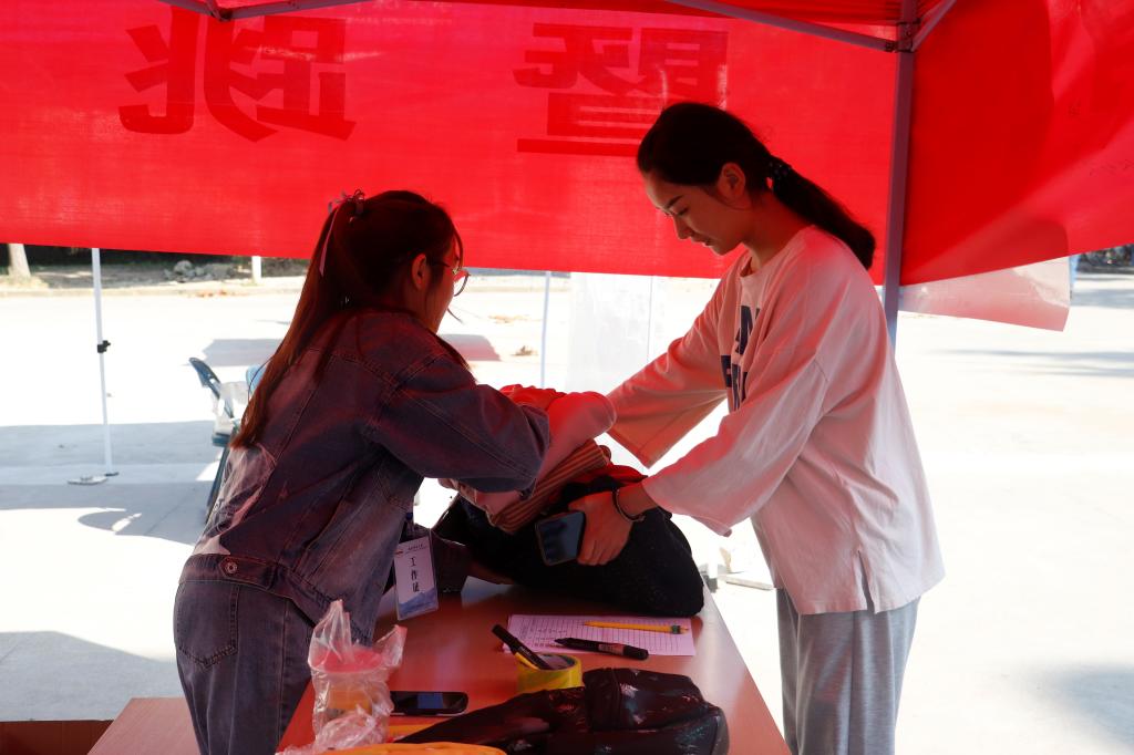 在活动现场,负责人和志愿者详细介绍活动方式和流程,并引导学生们捐赠衣物和义卖闲置物品。活动负责人尚琳表示“‘绿色捐衣’活动不仅是为了回收军训服,提高资源利用率,更是旨在提高大学生勤俭节约的意识,感恩回报社会的意识。”