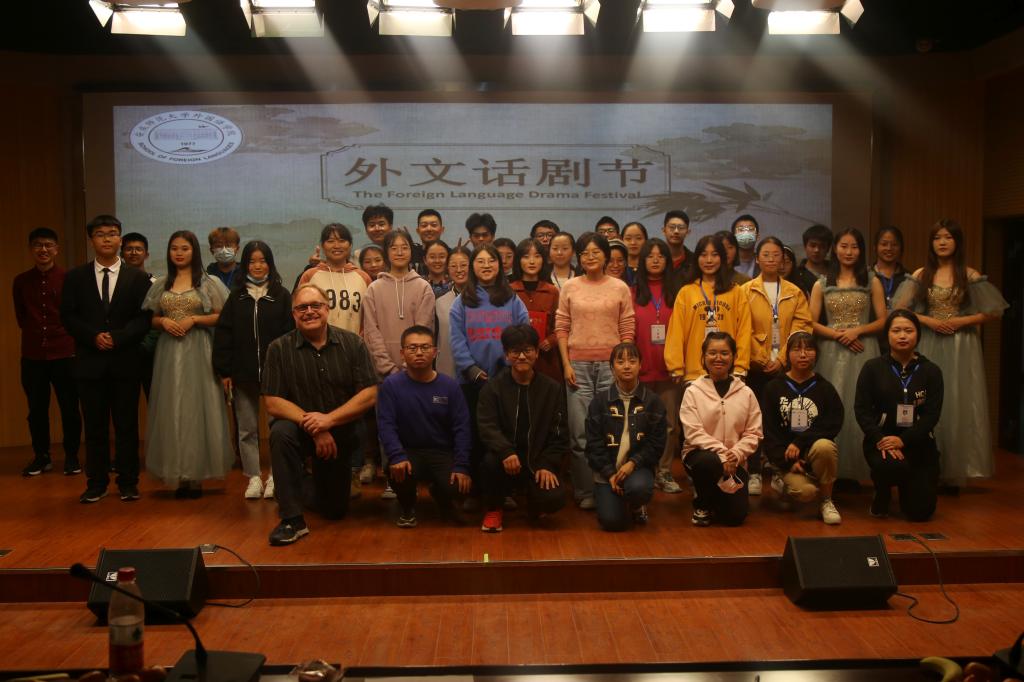 在E503教室举办第十一届外文话剧节决赛,学院党委书记郝涂根、院长王先荣、副院长江加宏、党委副书记夏斐、部分辅导员和外教Dave出席并应邀担任本次比赛的评委,海角