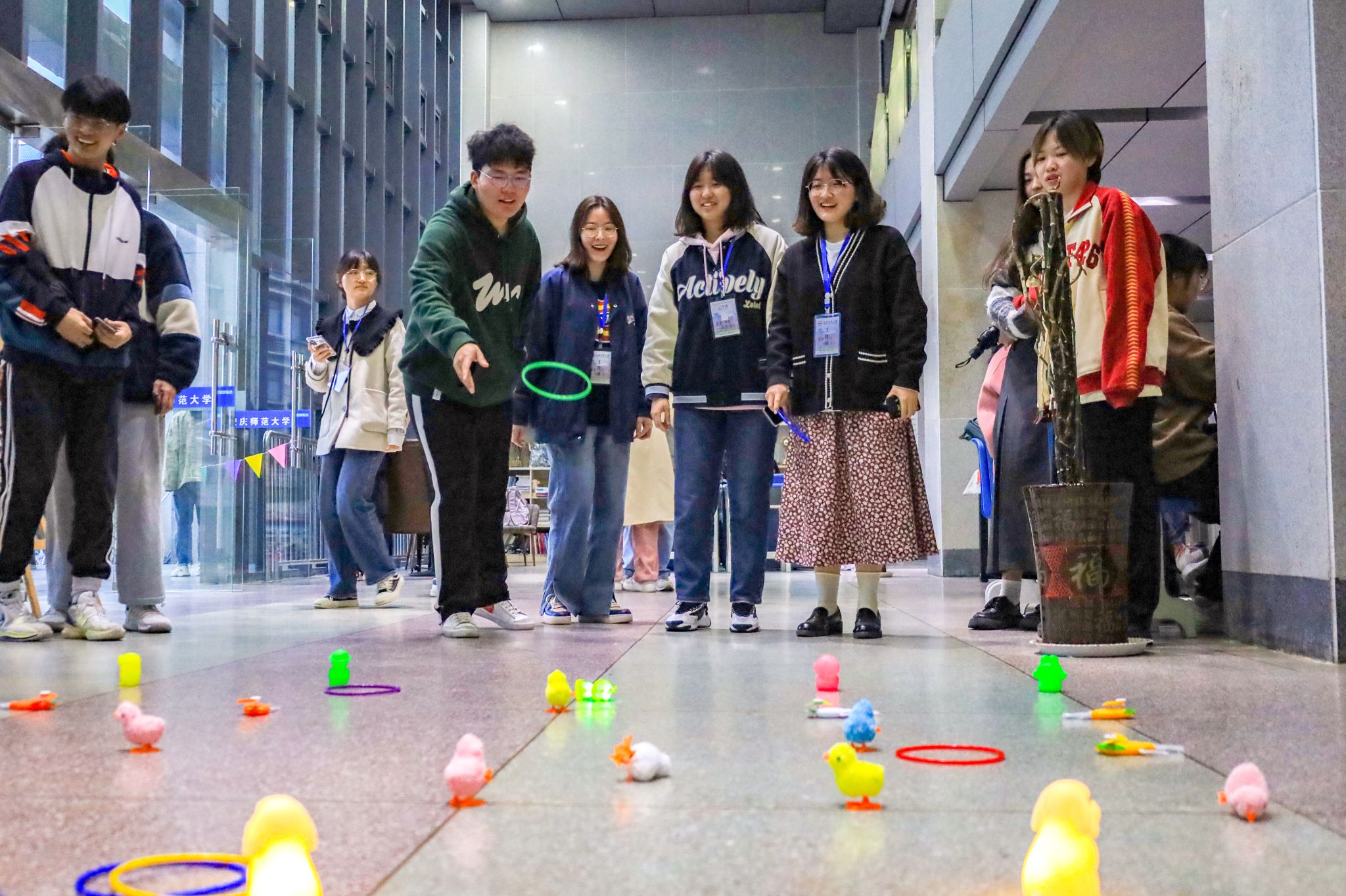 “很惊喜我能一下套中两个玩具,以前玩游戏都是空手而归的。”环境科学与工程类专业2022(3)班的张美芳“幸运buff”加满,成功套中玩偶和手持泡泡机。她表示,从高中升入大学以来,她感觉自己的交友范围仅限于寝室,觉得自己不适应大学生活。“看到套中玩偶会有成就感,觉得自己也释放了一些心理压力。”