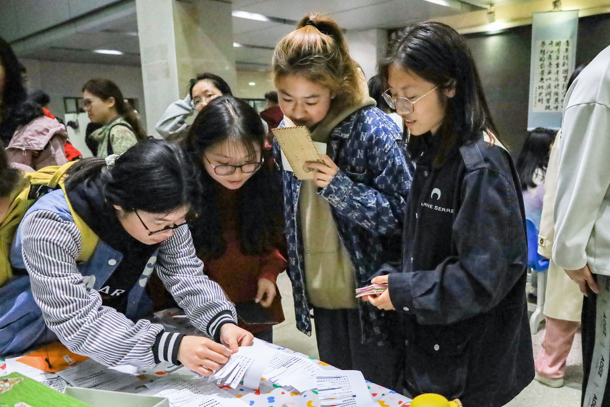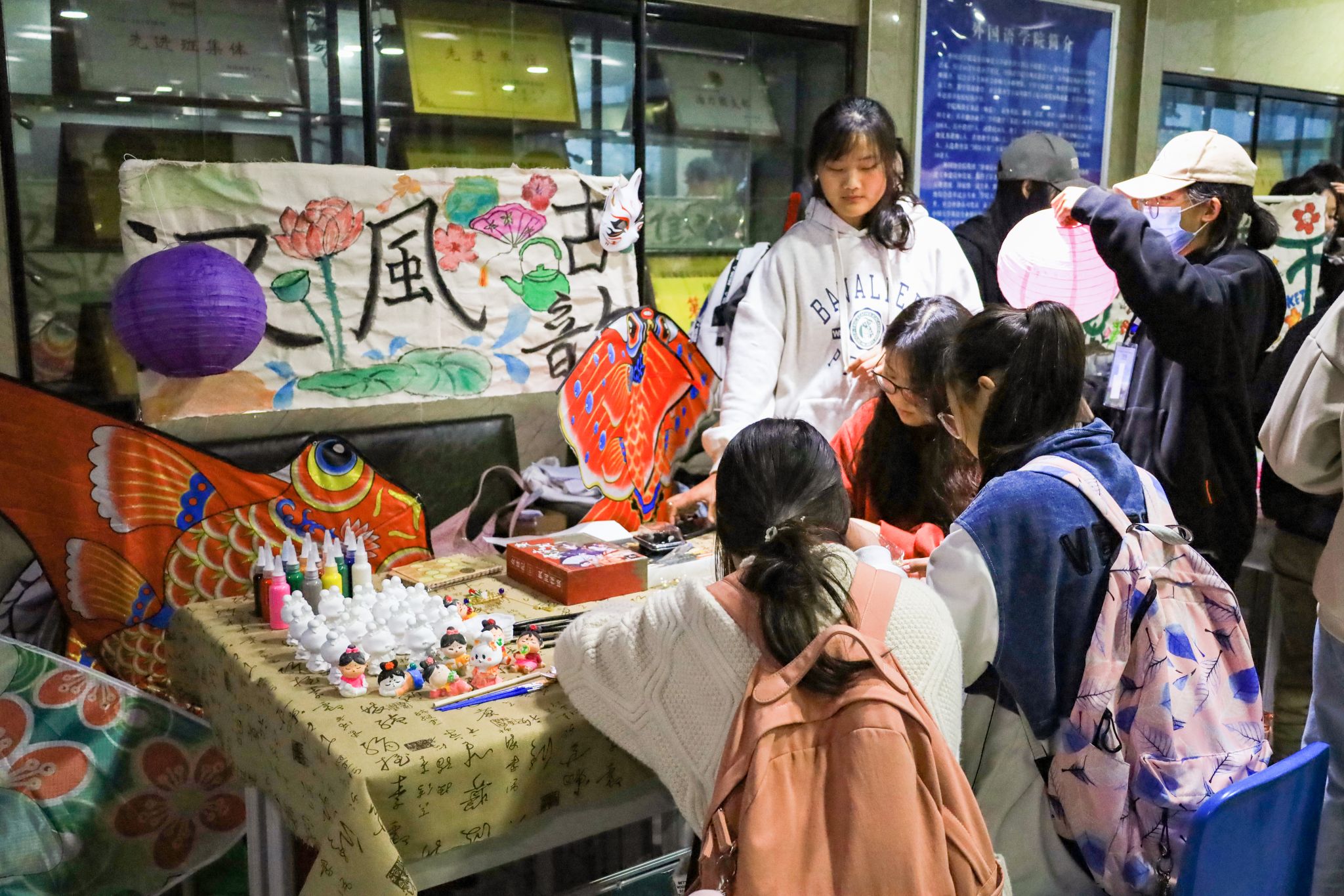 联合美术学院一起分设了5个特色摊位,从饮食、服饰、艺术等方面引导学生走进传统文化、了解世界文化。