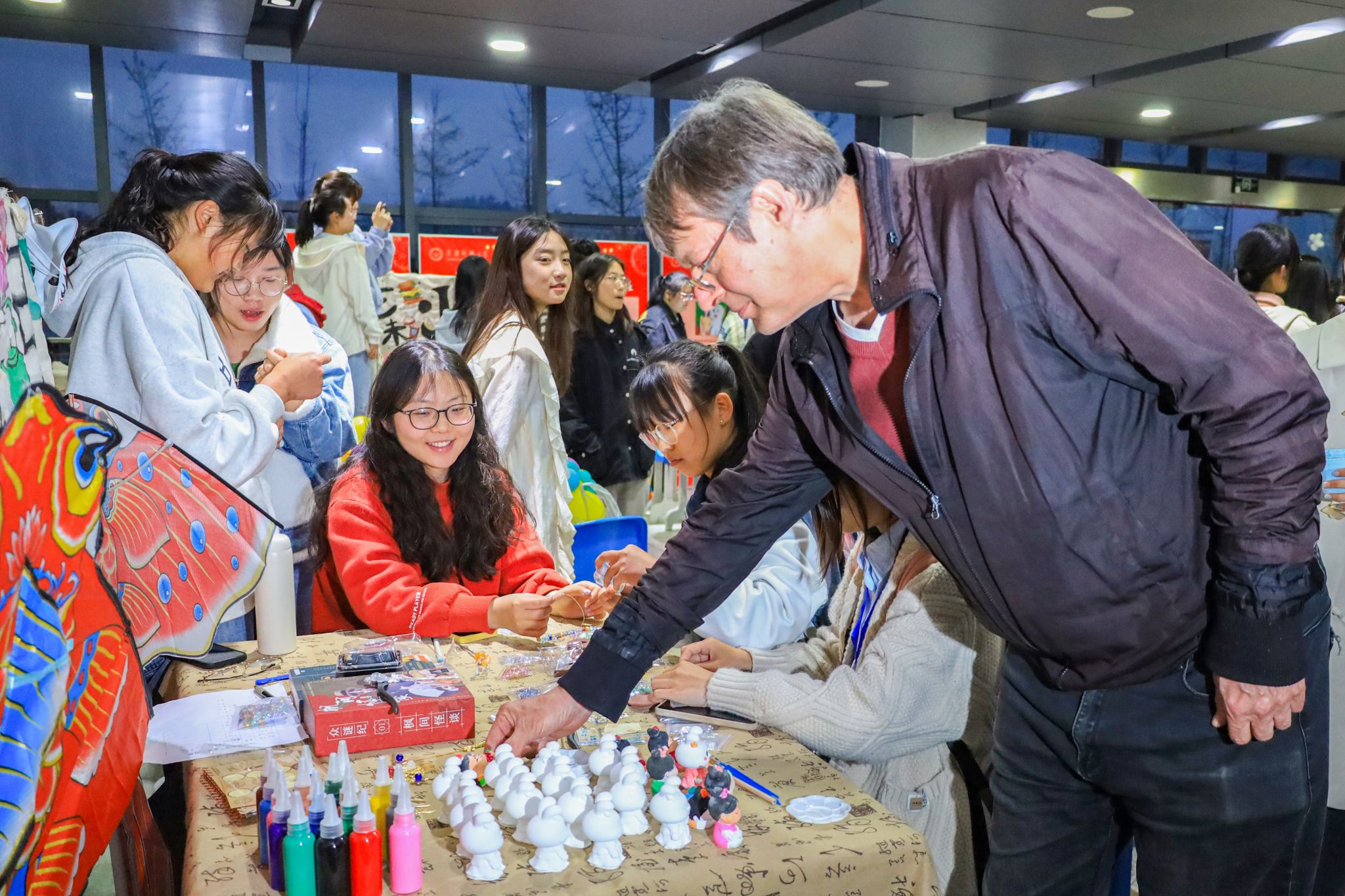 的汉风古韵铺和美术学院的艺见倾心展合力打造“艺术天堂”,引得不少学生停足驻留。外国语言文学类专业2022(3)班的丁明雅现场制作古风手链,直言“过了把古风瘾”。