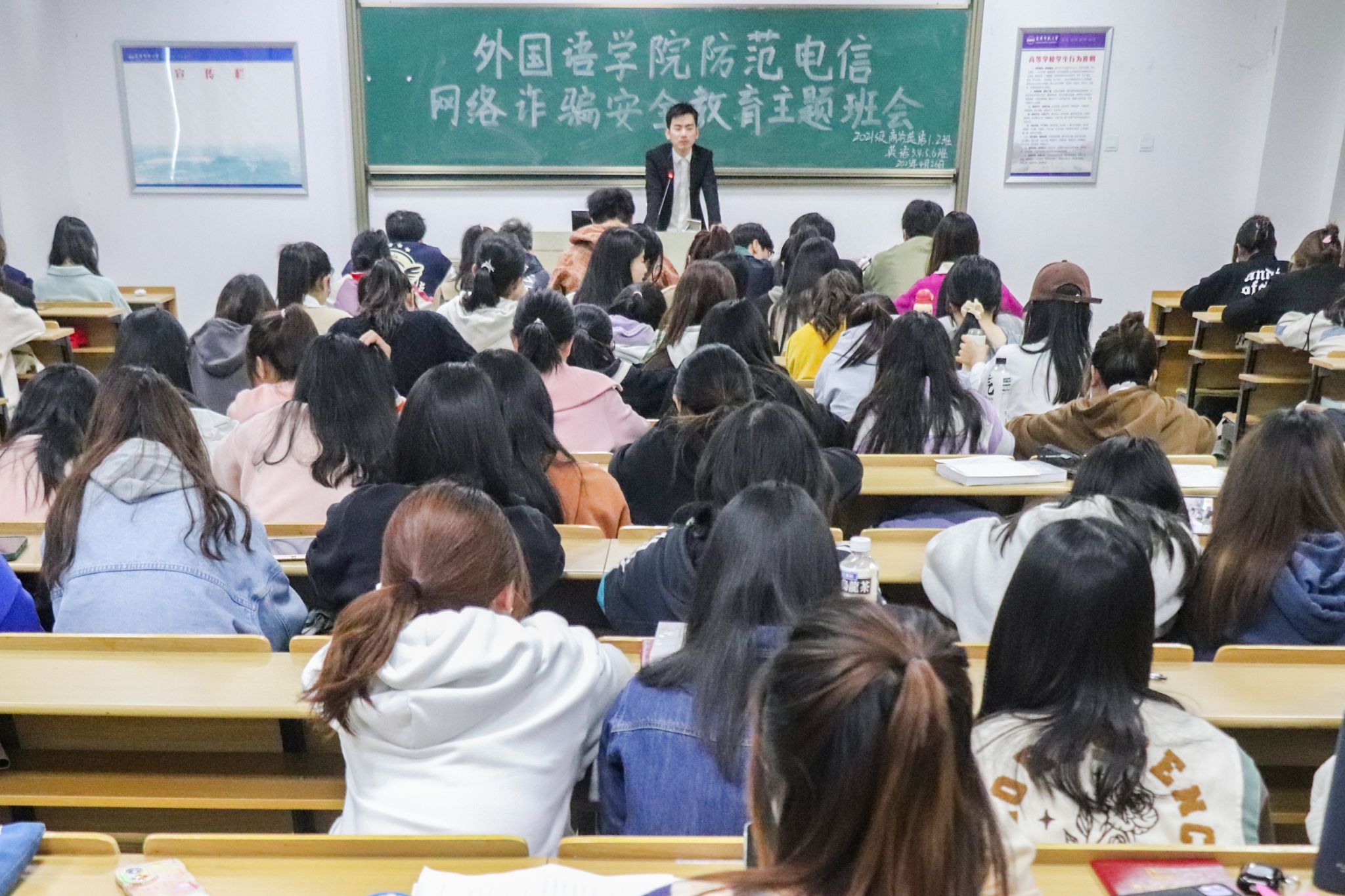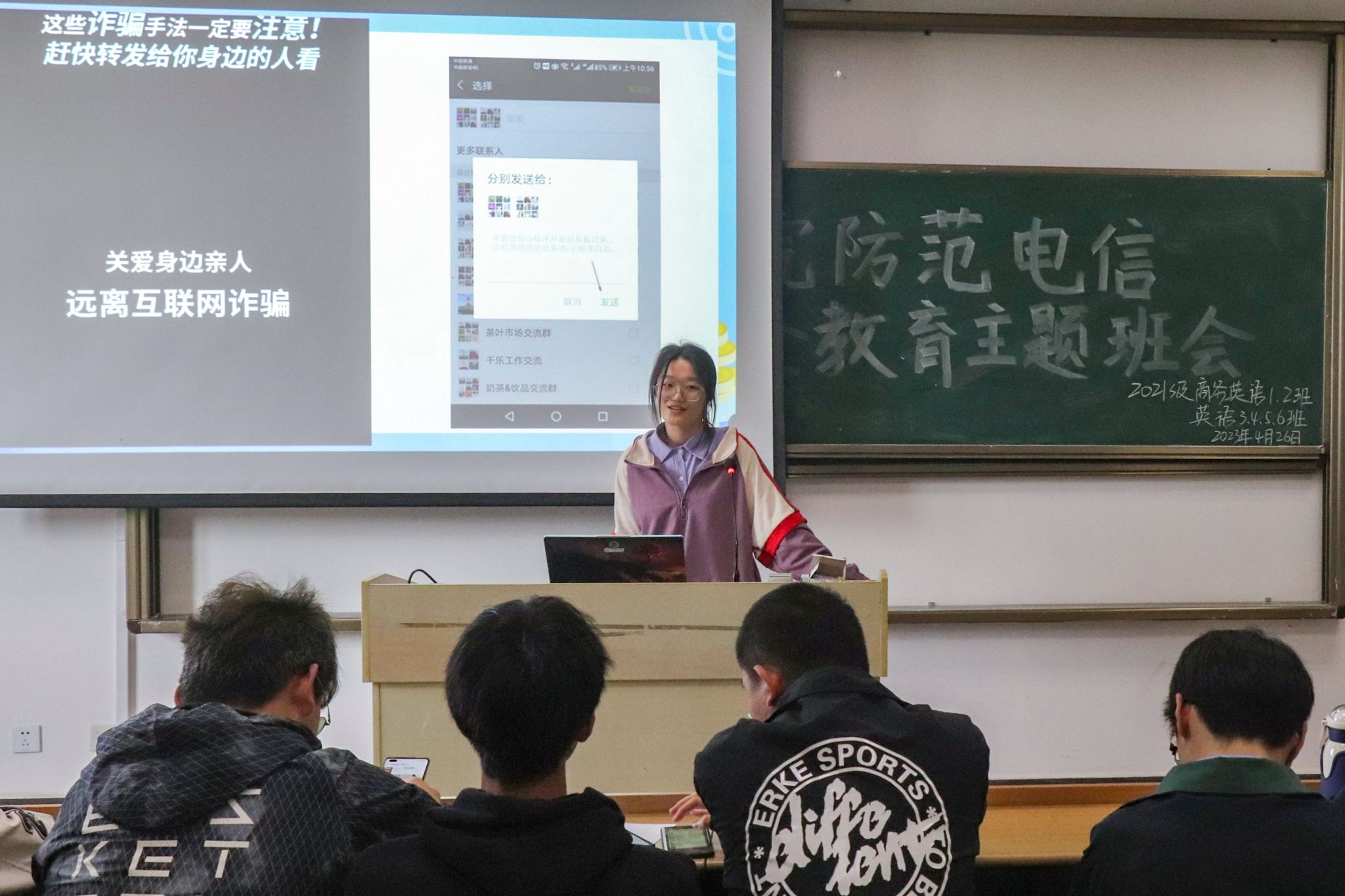 商务英语专业2021(1)班、商务英语专业2021(2)班以及英语专业2021(3)至(6)班在206教室开展联合班会。近200名学生成为班会“主讲人”,用多样化方式宣讲防范电信网络诈骗知识。