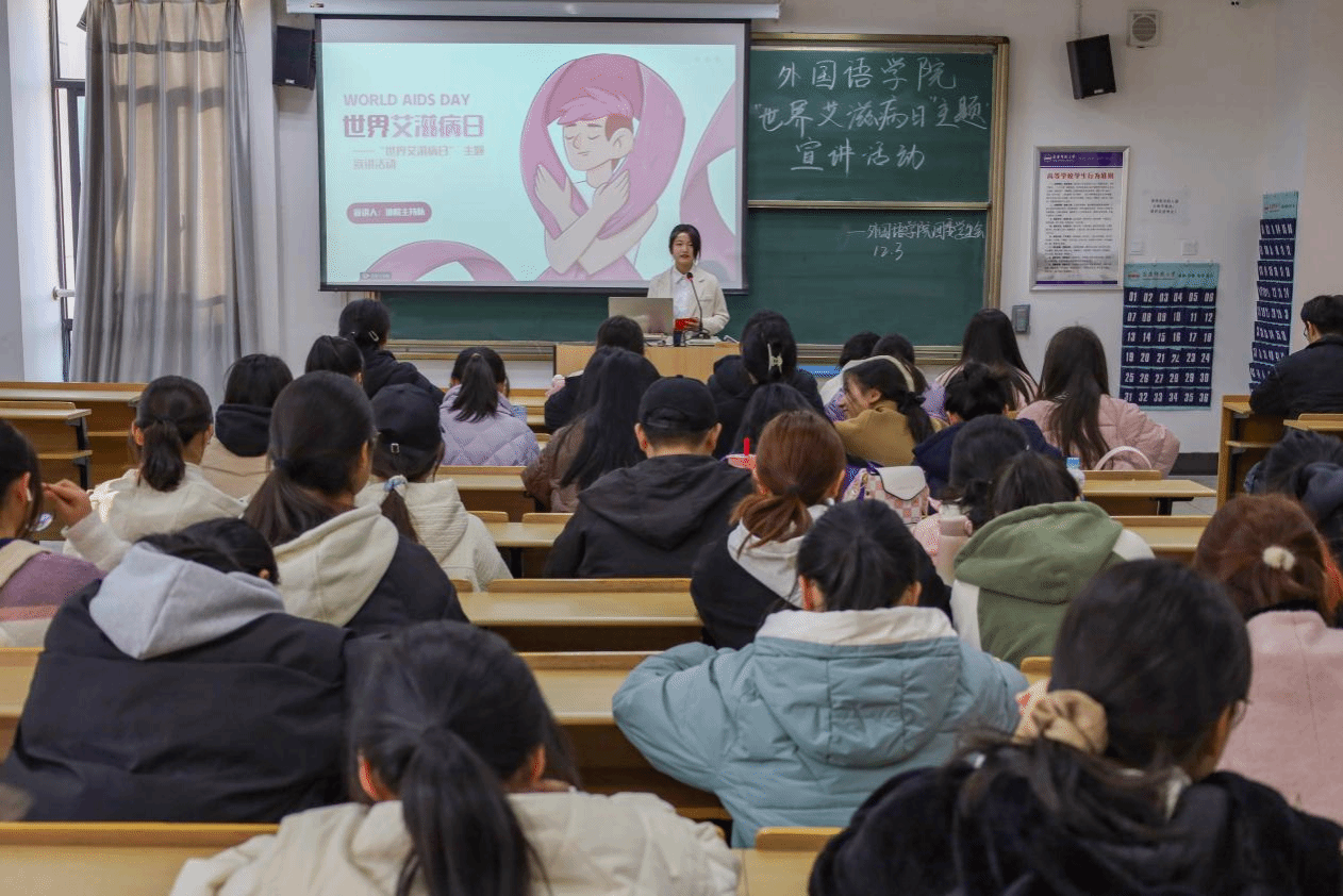 于E楼320教室开展“世界艾滋病日”主题教育宣讲活动,学院主持队成员进行宣讲,近百名同学到会聆听。