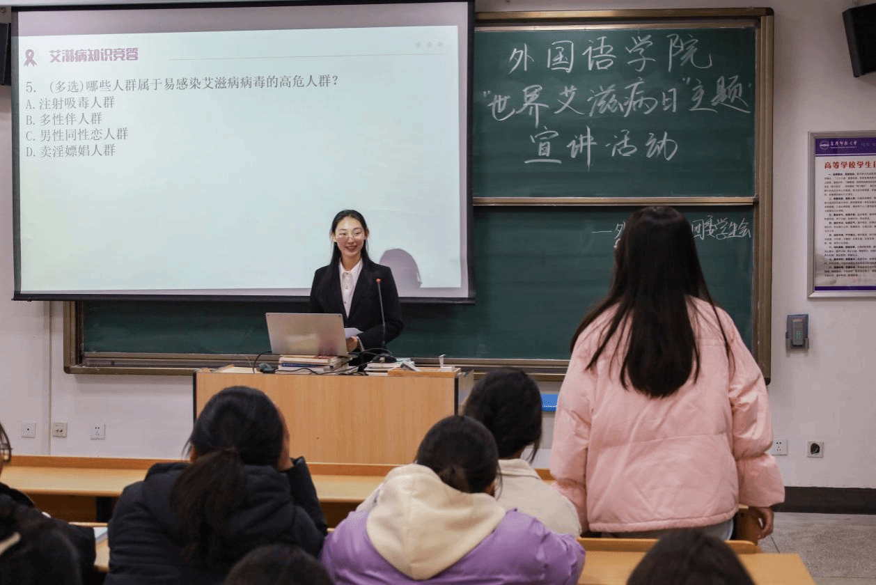 “艾滋病传播主要有哪些途径?”“哪些人群属于感染的高危人群?”……知识竞答环节,学生们接连举手抢答。“主题宣讲是一个宣传艾滋知识的有效途径,能够帮助学生提高防艾意识,传播艾滋病知识,培养学生的责任感和自我保护能力。”多次抢答成功,外国语言文学类专业2023(7)班的张敏雪表示,艾滋病毒不会通过普通皮肤接触传播,而艾滋病人却往往因为身染病毒而受到歧视,成为弱势群体,如果大家能够更加了解艾滋知识,生活中会少许多偏见。