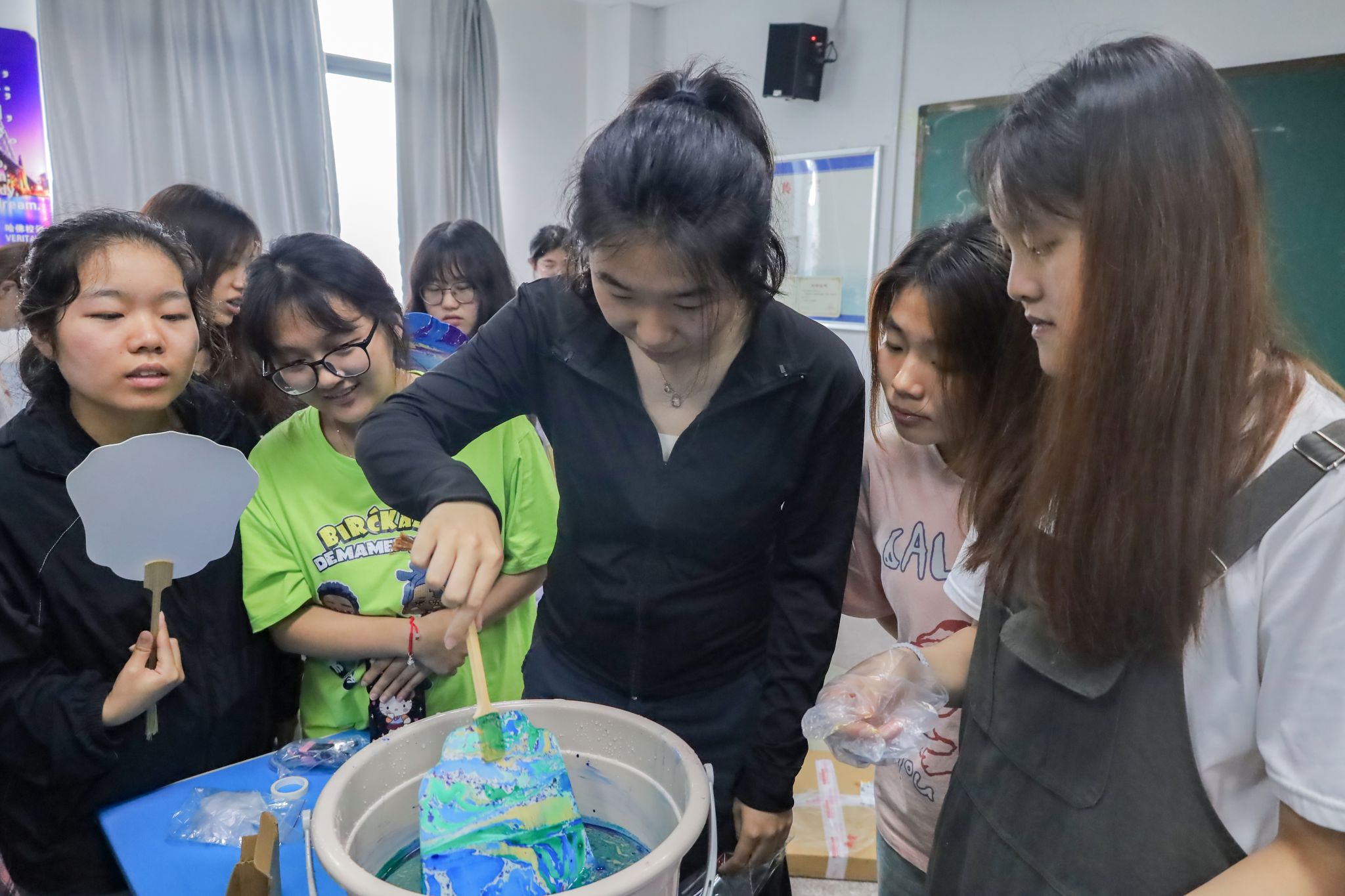 将大漆滴入水中,形成五彩斑斓的色块,倾斜或旋转着将扇骨逐渐浸入水中,漂浮的漆点粘附在扇面上形成独特的纹理图案,一入一出中风格迥异的漆扇就此在学子们手中呈现。“与每个独一无二的漆扇相同,我们也是世界上独一无二的存在。”外国语言文学类专业2023(3)班的陈欣怡直言,希望能在“六一”为班级学生送上独一无二的礼物,让他们在动手制作中找到属于自己的色彩。