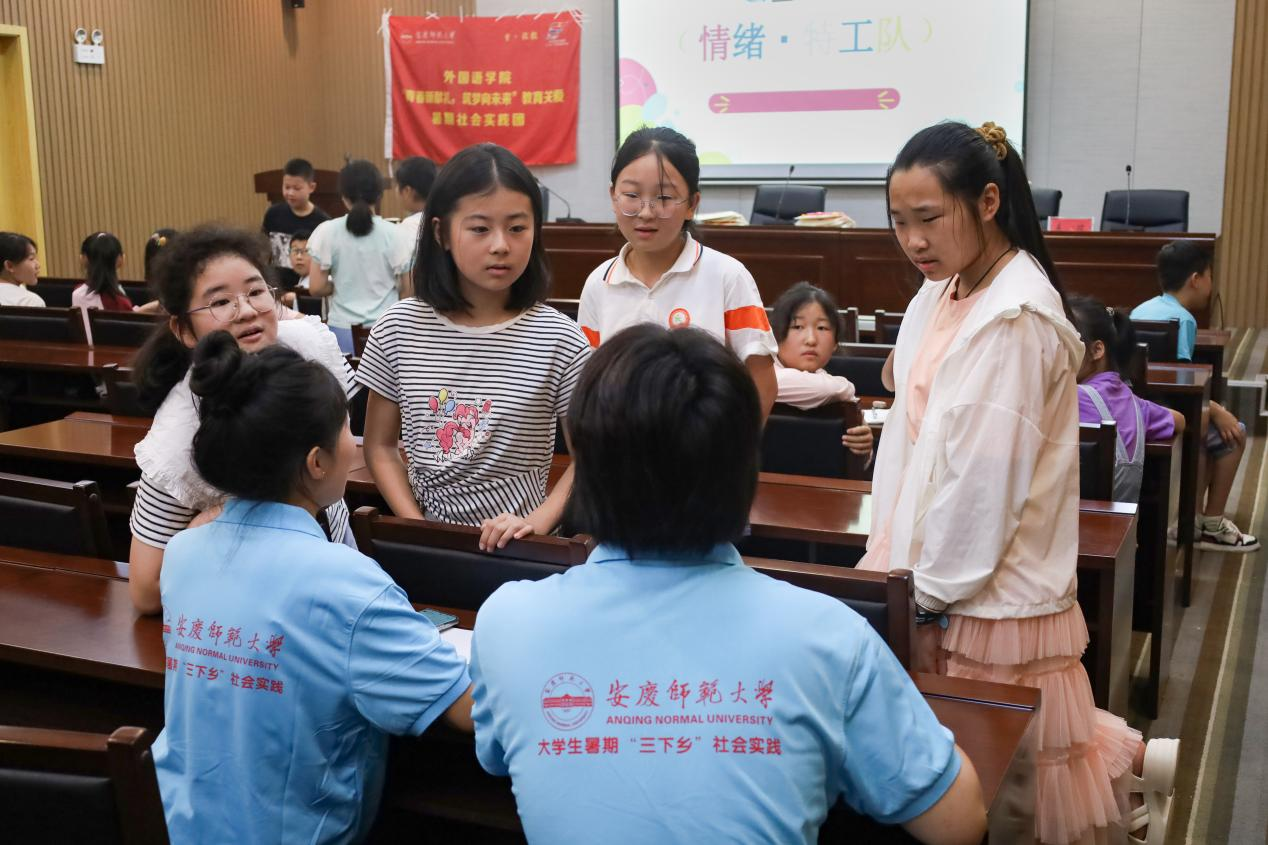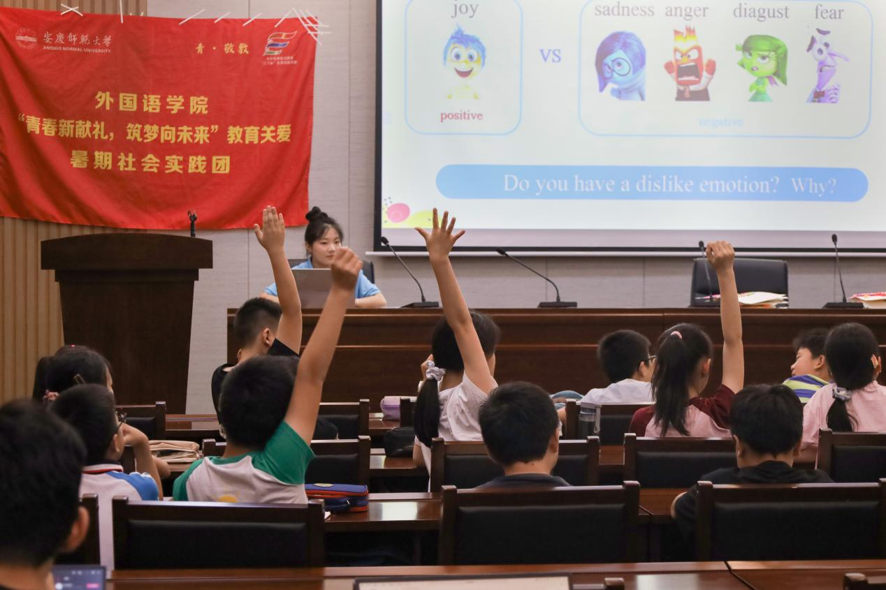 “青春新献礼,筑梦向未来”教育关爱实践团走进怀宁县“青年之家·红领巾”学堂,携手小学生开展“领略文化交融,深悟语言魅力”主题课程,带领他们游世界国家,探文化风情。