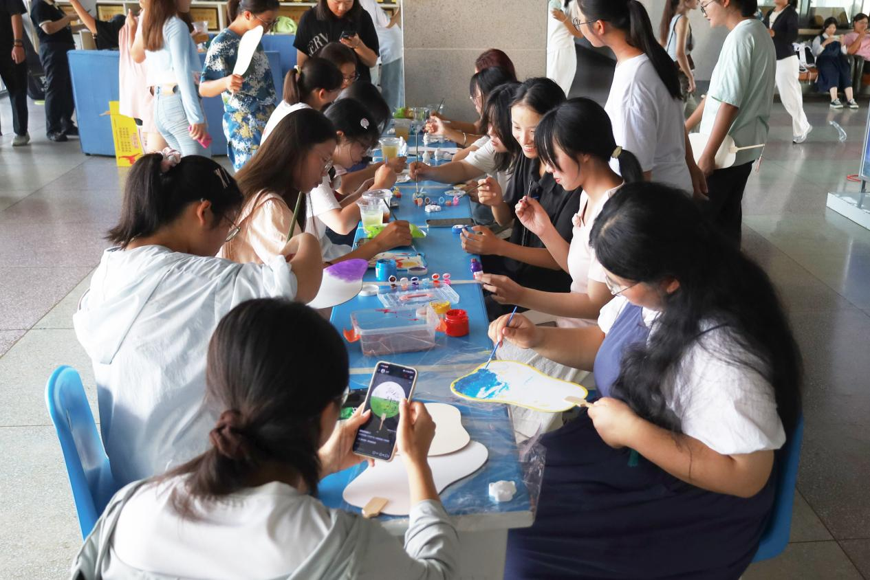 先将颜料挤入调色盘中备用,再把各色的颜料按比调配,最后用蘸有水粉颜料的笔尖在团扇上细细描绘……学生们手握画笔,经过约一个半小时的精心绘制,玉兔、月亮、桂花等元素跃然出现在团扇中,构成一幅幅“中秋佳景”。“玉兔抱着月亮,兔脚下是流淌的小溪。”外国语言文学类专业2024(7)班的张文静介绍着自己绘制的团扇。“中秋节自古以来就是阖家团圆的日子,恰巧碰上军训不能回家,只好把浓浓的思乡之情寄托于画中。”她说。