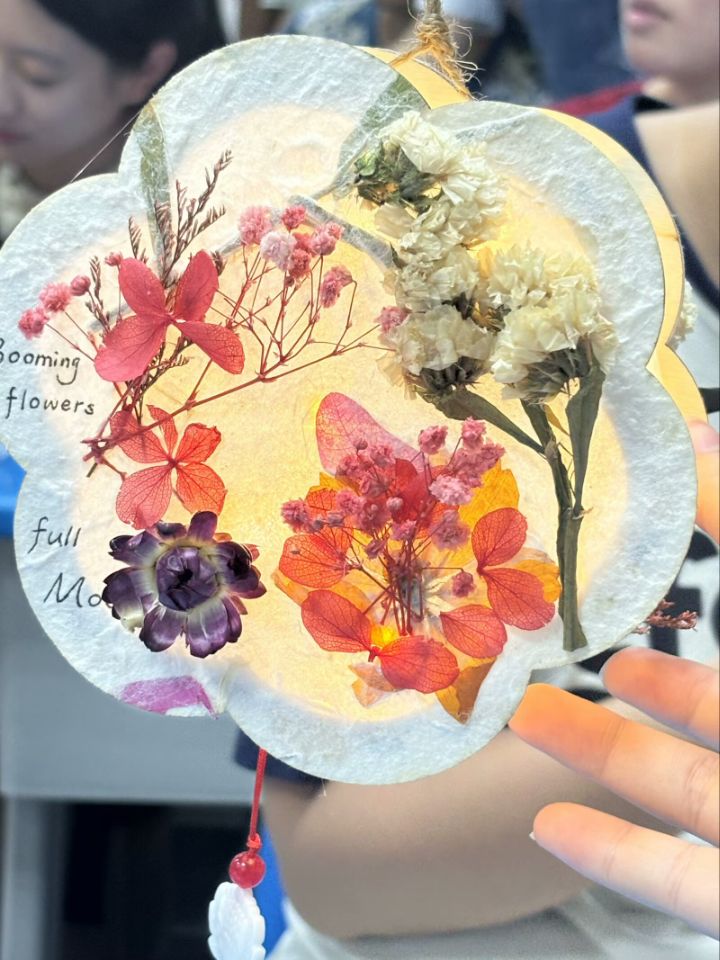 花灯作为中国传统节日的重要元素之一,不仅具有观赏价值,更承载着人们对美好生活的向往和祝福。了解了中秋节的起源和习俗之后,同学们就进入花灯制作环节。同学们分工明确、协调合作,先拼装好花灯的框架,接着选择不同的干花,经过讨论,将干花拼成不同的形状,并用胶水将其贴在灯面上。最后装上小灯,一盏独一无二的花灯就完成了。完工后,同学们选举自己心仪的花灯并进行奖励。花灯制作不仅锻炼了同学们的动手能力,更让他们深刻体会到传统工艺的独特魅力。