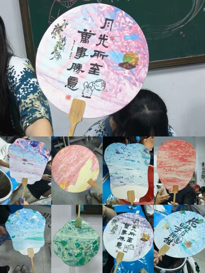 漆扇不仅承载着古人的智慧与匠心,更寓意着团圆与和谐,成为中秋佳节不可或缺的文化符号。在漆扇制作环节,同学们分成小组,迫不及待地投入其中。现场,他们共同讨论如何挑选扇骨、搭配颜料以及绘制图案等步骤。在绘制图案的过程中,他们或挥毫泼墨,或细心勾勒,将心中的美好愿景化作扇面上的艺术佳作。大家逐渐体会到了漆扇制作的不易与乐趣。一幅幅精美的漆扇在他们手中诞生,每一幅都凝聚着他们的心血与智慧。